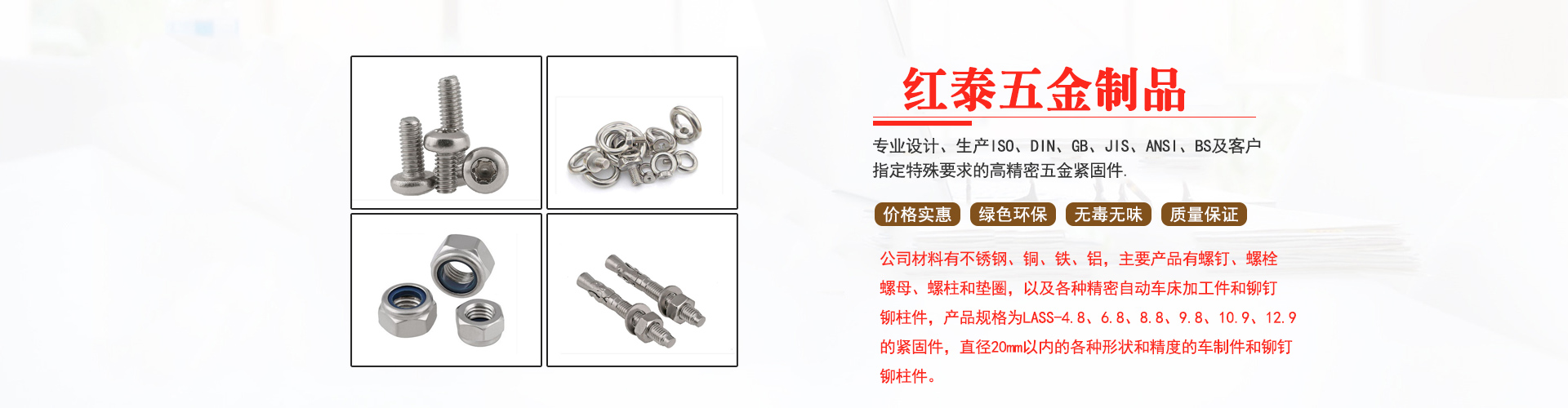東莞市紅泰五金制品有限公司,公司占地六千多平方米,擁有五十多組螺絲機(jī)及六十臺自動(dòng)車床設(shè)備。是一家專業(yè)設(shè)計(jì)、生產(chǎn)ISO、DIN、GB、JIS、ANSI、BS及客戶指定特殊要求的高精密五金緊固件的制造企業(yè)。